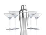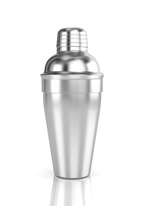 A cocktail shaker is a tool used in mixing and preparing alcoholic beverages such as cocktails. It is a metal container with a lid that seals tightly to prevent spills. The container has a tapered shape, with a wider base and a narrower top. This design allows for easy mixing of ingredients by shaking them together. The lid has a built-in strainer to separate the liquid from the ice and other solid ingredients. The shaker is made of stainless steel.