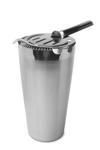 A strainer for cocktail shakers is a bar tool used to strain ice and other solid ingredients from mixed drinks, while pouring the liquid portion of the cocktail into a serving glass. It is made of metal, with a flat, perforated disc that fits over the mouth of the shaker. The strainer is held in place by placing a finger over the small, handle-like protrusion on one side of the disc, while pouring the liquid out through the larger opening on the other side. The perforated disc helps to filter out any small bits of ice or fruit that might be left in the mixture, resulting in a smooth and refined cocktail. The strainer also has a spring around the edge of the disc that helps to hold it securely in place over the shaker, preventing any spills or drips.