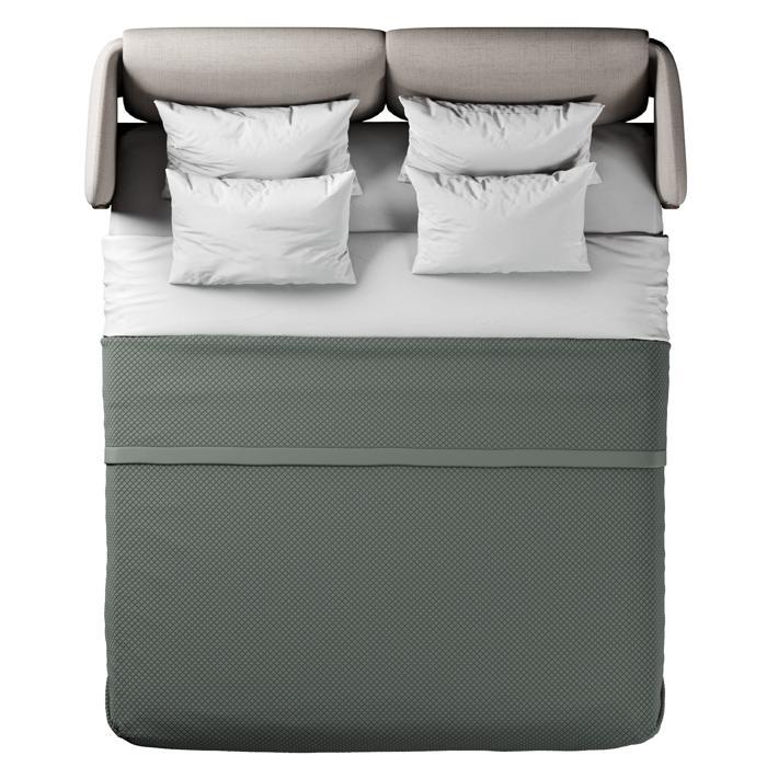 A double-sized bed with a sofa headboard is a unique and versatile piece of furniture that combines the comfort of a bed with the functionality of a sofa. The bed frame is rectangular and large enough to accommodate a standard double mattress. The headboard is in the form of a sofa, which is attached to the top of the bed frame. The sofa headboard provides a comfortable backrest for sitting up in bed to read, watch TV, or work on a laptop. The sofa headboard is upholstered in a soft and durable fabric, providing a comfortable seating surface. Overall, a queen bed with a sofa headboard is a practical and stylish piece of furniture that can add both comfort and functionality to any bedroom.