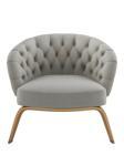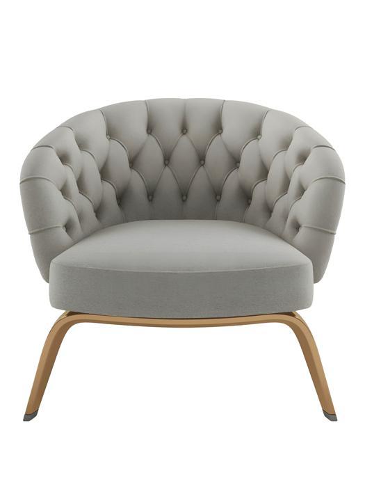 A tufted armchair with brass legs is an elegant and luxurious piece of furniture. The chair typically features a deep seat and a high backrest, which are both padded and upholstered with soft and plush material. The tufted design creates a sophisticated and timeless look, while the brass legs add a touch of glamour and sophistication. The legs give the chair a sleek and modern appearance. The armrests are curved and plush, providing both comfort and support for the arms. Overall, a tufted armchair with brass legs is a stylish and comfortable addition to any living space or lounge area.