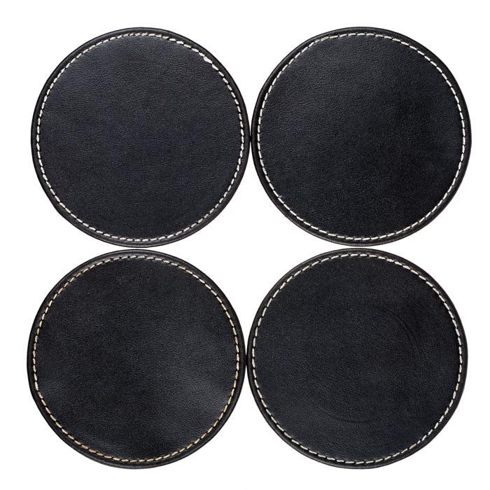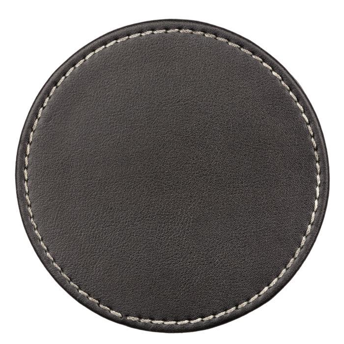 A round black coaster is a small, flat disc-shaped object, which is placed under a drinking glass or cup to protect the surface of a table or other furniture from water rings or spills. The coaster is circular in shape and has a solid black color, giving it a sleek and minimalist appearance. Its surface is smooth to provide a non-slip grip for the glass or cup. The edges include a stitching ornamentation, adding to the coaster's aesthetic appeal. Overall, a round black coaster is a functional and stylish accessory that is perfect for any home or office setting.