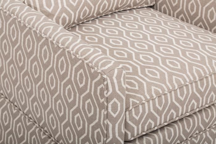A traditional armchair with a geometric pattern has a classic design with a touch of modern flair. The chair has a wooden frame and legs. The chair has a high back, providing a comfortable place to sit and relax. The cushioning is plush, offering a soft feel to the seat and backrest. The geometric pattern adds a visual interest and texture to the overall look of the chair, providing a subtle yet eye-catching element to the decor of the room. Overall, a traditional armchair with a geometric pattern could be a great addition to a living room, study, or bedroom, offering both comfort and style to the space.